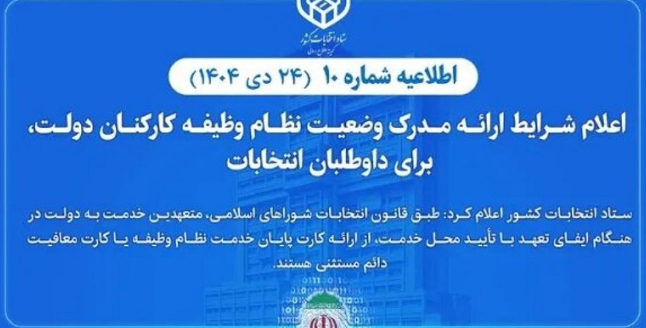 ستاد انتخابات کشور در اطلاعیه شماره ۱۰، شرایط لازم برای ارائه مدرک وضعیت نظام وظیفه کارکنان دولت را برای داوطلبان انتخابات مشخص کرد. این اطلاعیه به...